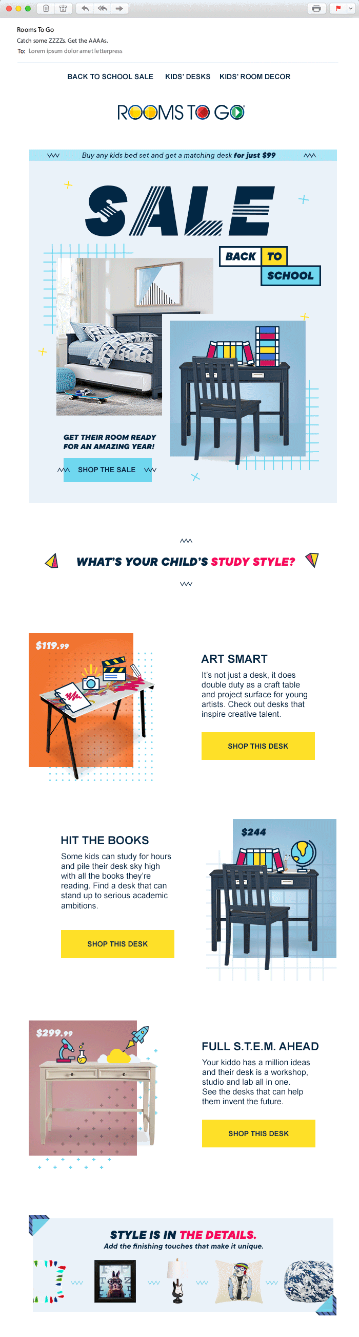 Instead of just focusing on amazing desk deals, we used our expanded email real estate to tell a series of mini stories about how a kid’s desk is a space that helps them become who they are meant to be.